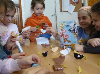 A Hajdúböszörményi Bocskai István Általános Iskola és Városi Sportiskola 1.b osztálya a csatolt képekkel igazolt pályaművel indul a Keltsük életre a betűket! pályázatban. A debreceni imami weboldalon 15 szülő regisztrált, így a Berg Judit: Rumini című könyv alapján elsőseinkkel megalkottuk a Szélkirálynő hajóját, fedélzetén Ruminivel, Balikóval és a hajó további legénységével együtt.Mi nem lemásolni szerettük volna a piros árbócos hajót, hanem Hajdúböszörmény zászlajának kék-fehér színeit alapul véve, városunkhoz való tartozásunkat is beleszőttük e pályaműbe. A hajó, mint látják  műanyag olajosflakonból készült, az egerek papírból, mind a gyerekek keze által és a tanító nénik segítségével.