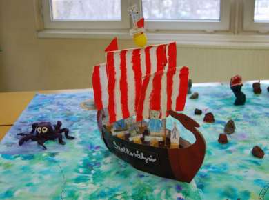 Elkészítettük a Szélkirálynő és az Aranyvadász makettjeit is, igyekeztünk a regényben szereplő képeket és leírásokat is felhasználni. A makett teljes egészében papírból készült. A vázat kemény kartonból vágták ki a gyerekek, majd erre ragasztottuk a vékony kartoncsíkokat, amiből végül kialakult a hajótest.