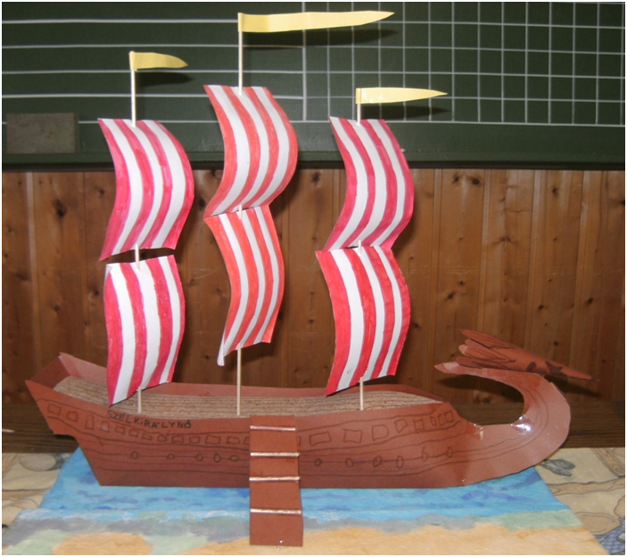 A Szélkirálynő kartonból, hungarocellből és parafalapból készült, az árboc hurkapálcából, a tenger és a part festett papírral borított hungarocellből.